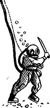 Наступила особенная, подводная тишина, когда слышишь, как колотится твое сердце. Опустил я вниз рукавицу, воздух вырвался через нее из рубахи, и доступ воды прекратился. А сигнальный конец мой застрял на лопасти винта. Надо мне обратно туда подняться.