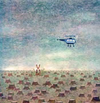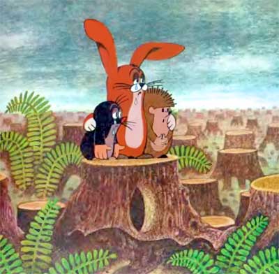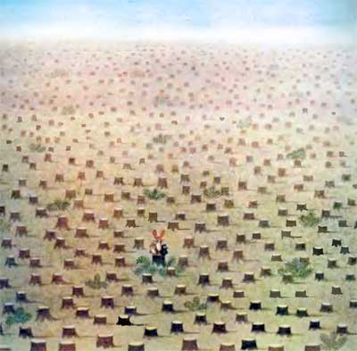 Неожиданно наступившая тишина показалась зверюшкам еще более зловещей, чем оглушительный вой машин. Куда ни посмотришь — всюду безжизненная пустота. Остались лишь одни пни да поваленные деревья, мертвые бревна, которые еще утром были лесом, переполненным жизнью. И от старого дерева, в котором жил Заяц, остались лишь спиленный ствол да пенек.