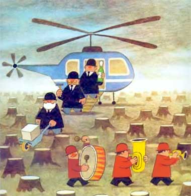 А трое друзей беспомощно наблюдали, как лес на их глазах превращался в голую равнину. От рева моторов и завывания пил у них противно гудело в ушах. Когда упало последнее дерево, звуки начали постепенно удаляться и, наконец, затихли.
