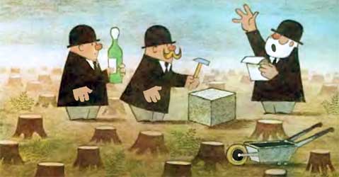 Местность вокруг преображалась на глазах. Десятки самосвалов привозили и сваливали тысячи кирпичей, мешки с цементом, панели и еще много удивительных вещей, которые наши друзья видели впервые в жизни. Появились и кухни на колесах, и санитарная машина. Прораб стройки распорядился было снести пень, но, после ознакомления с документом, извинился и сказал, что все в порядке. Больше наших зверюшек никто не трогал