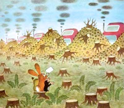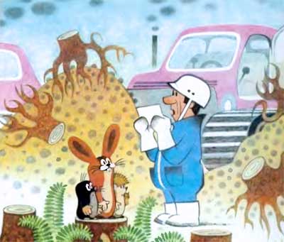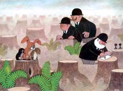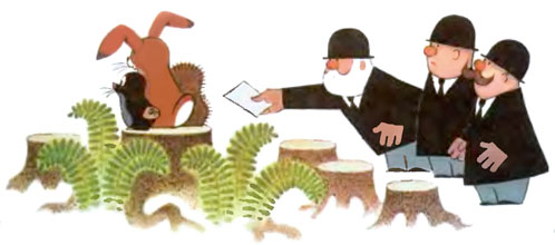 Через несколько дней они снова услышали гул моторов. На этот раз машины были еще мощнее и работали с ужасающим ревом. Выстроившись в один ряд, они все одновременно двинулись вперед. С жутким воем машины вступали в бой со всем, что встречалось на их пути: переворачивали комья глины, одним махом выкорчевывали пни из земли и заодно расщепляли их. Прижавшись друг к другу, друзья с тревогой ждали, что будет дальше. И тут Заяц вспомнил про документ, который им дали важные люди, и начал отчаянно размахивать бумагой.