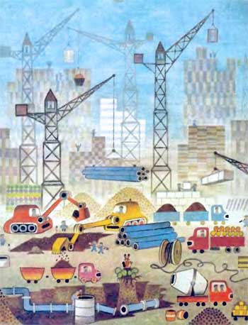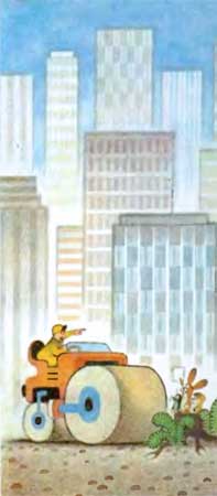 Каждый день друзья наблюдали, как разные предметы на стройплощадке складываются, соединяются и растут ввысь. Пень обступили стены высоких домов, среди которых зверюшки чувствовали себя беспомощными и одинокими. Им казалось, что их островок, их пень с каждым днем становится все меньше.