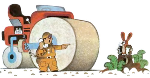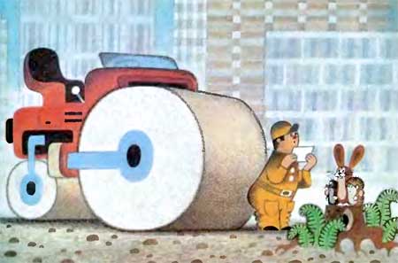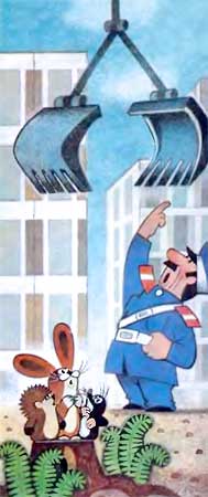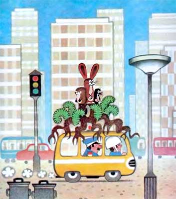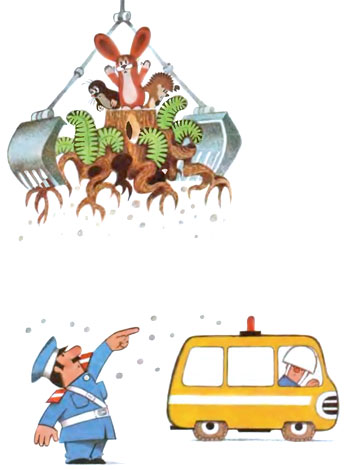 — Что едет? Кто едет? — всполошился Заяц, но перед ним уже со скрежетом остановился автокран. Его стрела двинулась в сторону пня, огромные челюсти ковша крепко вцепились в пень и вместе с испуганными зверюшками подняли его вверх.