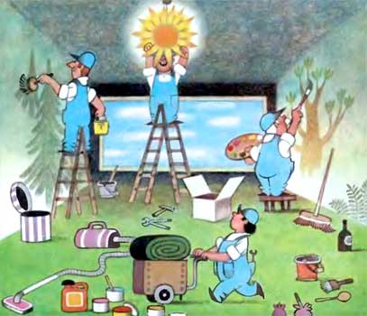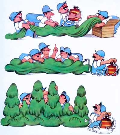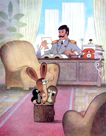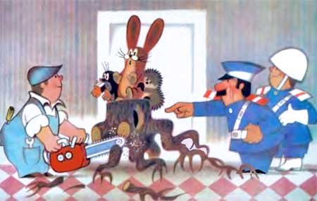 — Это дело поправимое, — сказал один из них и позвал человека с ручной пилой. Корни пня были тут же спилены и в мгновение ока он превратился в обрубок бревна, который Ёжик с Зайцем вкатили в комнату и поставили перед столом самого начальника. Крот шел впереди и размахивел уже несколько помятым документом.