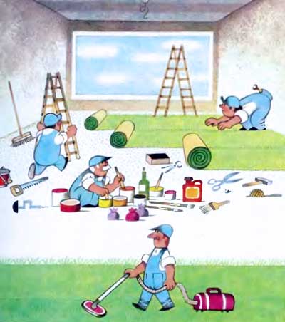Пока друзья-приятели нетерпеливо вертелись в кресле, с последнего этажа соседнего дома доносились звуки пилы и стук молотка, какое-то шипение и скрипение, иногда раздавались человеческие голоса.