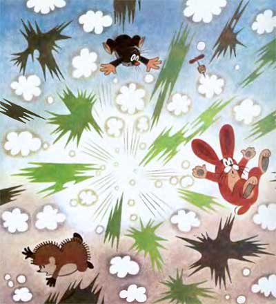Деревья оттолкнули его и он еще быстрее полетел обратно. Пролетев по воздуху, Крот со штопором в лапках шлепнулся в траву, и тут раздался взрыв.