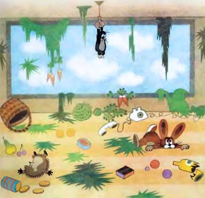 Крот завис под потолком на остатках солнышка. Внизу среди остатков елочек и газона, разбитых бутылок с соком и остатков овощей и фруктов застыли Заяц и Ёжик. Они так напугались, что не сразу заметили Крота, покачивавшегося под самым потолком.