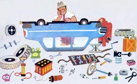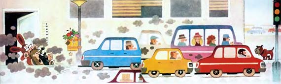 Светофор как раз переключился на зеленый свет и машины помчались вперед. Только синяя не могла сдвинуться с места. После нескольких неудачных попыток ее владелец вышел и принялся искать поломку. Он открыл капот и долго-долго копался в моторе, разбирал и собирал детали и сердито ворчал себе под нос. Около него проезжали десятки мешин, оставляя зе собой хвосты ядовитого дыма.