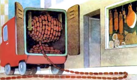 Тут рядом с ними, перед мясным магазинчиком, остановился грузовик с копчеными сардельками-шпекачками.
