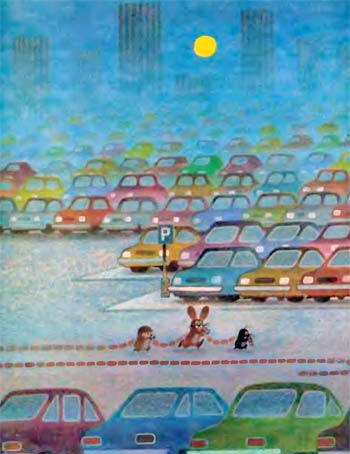 Заяц обернулся и обнаружил, что друзья его исчезли за завесой черного дыма. Когда дым немного рассеялся, перед ними остановилась синяя машина и пустила им в нос очередную порцию едкого дыма.