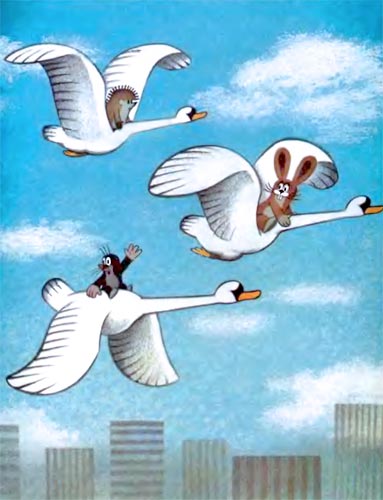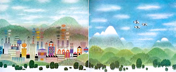 Пока друзья летели по воздуху, быстро удаляясь от зачумленного города, они мечтали о краях, где нет ни дымящих труб, ни бетонных стен, где растет огромный светлый лес, ясно светит солнышко и каждое утро на траву падает роса. Представляли себе душистую лужайку, на которой им не нужен будет важный документ — и понемногу забывали о серых, грязных улицах и рёве включенных моторов.