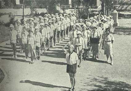 Каждый лагерь разбит на пионерские отряды. Отряд живет самостоятельной жизнью и ведет работу по плану. Вожатый составляет план совместно с отрядом, учитывая наклонности и желания самих ребят. Чему только не хочется научиться ребятам за время пребывания в Артеке! И грести, и плавать, и фотографировать, кататься на велосипеде, изучить азбуку Морзе, составить гербарий, сделать модель аэроплана, сдать как можно больше норм на оборонные значки. Хочется облазить все горы, вдоволь накататься на лодке, наловить и высушить крабов и многое, многое другое.
