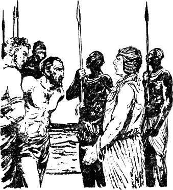 Опять носорог бросился на людей, снова послышались вопли. Кидого выступил вперед. Ноздри негра раздувались, в нем загорелся тот боевой огонь, который рождается при смертельной опасности, когда человек забывает обо всем, кроме необходимости сражаться, сражаться во имя жизни. Отскочив от страшного рога, грозившего неминуемой гибелью, Кидого метнулся вслед за проскочившим мимо чудовищем и, не помня себя, вцепился ему в хвост. Пандион, очнувшийся от потрясения, поднял с земли валявшуюся сеть. В этот момент он почувствовал, что должен быть впереди товарищей, которые телами заслонили его, оглушенного. Смутное воспоминание мелькнуло в голове эллина — поляна на Крите, опасная игра с быком. Носорог был мало похож на быка, но Пандиои решил использовать критский прием. Перебросив через плечо свернутую сеть, Пандион бросился к носорогу. Зверь в это время остановился, брыкнув задними ногами, поднял тучу пыли и далеко отбросил Кидого. Поняв план Пандиона, два ливийца сбоку отвлекли внимание зверя, а молодой эллин прыжком настиг чудовище и прижался к его боку. Носорог молниеносно повернулся — кожа Пандиона разодралась о твердую шкуру. Пандион почувствовал страшную боль, но, забыв обо всем, вцепился в ухо чудовища. Как некогда девушка на Крите, Пандион перебросил тело через туловище зверя и очутился на его широкой спине. Носорог заметался. Пандион цеплялся изо всех сил. «Только бы удержаться, удержаться», — вертелось в мозгу молодого эллина.