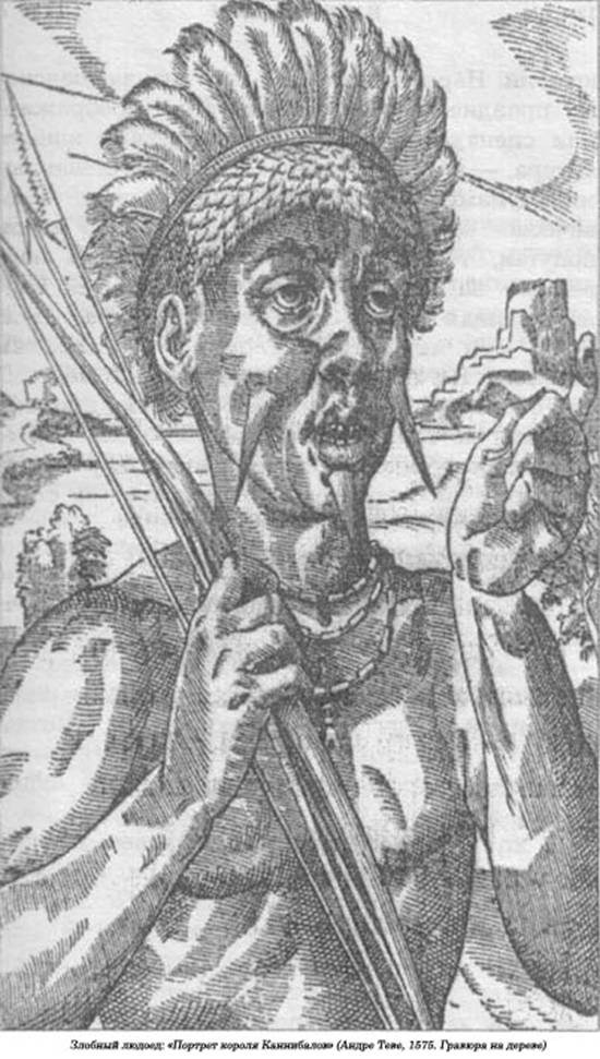 Ему приведется столкнуться с ними только два года спустя, во время своего второго путешествия через океан, когда он, высадившись справа от острова Доминики на Малые Антильские острова, обнаружил в одной деревне на Гваделупе, покинутой незадолго до этого всем населением, нетронутые яства людоедского пиршества. Вся эта леденящая душу сцена с подробными деталями изложена в приподнято-назидательном тоне в первой из восьми «Декад» Пьерра Мартира д'Агиейры, знаменитого итальянского гуманиста, живущего при испанском королевском дворе, члена совета обеих Индий, который в силу своих служебных обязанностей получал все материалы из первых рук для составления своей хроники великих географических открытий. Нарисованная им картина людоедского празднества на Гваделупе, — воображаемая сцена, на которой нет ни одного живого актера, — вся заполнена лишь расчлененными трупами: отрубленные руки и ноги, человеческое мясо в сосудах вперемешку с мясом попугая, только что отрезанная голова подвешена на шесте — с нее еще сочится свежая теплая кровь. Этот кошмар сыграл свою роль — он надолго обеспечил каннибалам рекламу. По всей Европе то и дело менялся их образ, и даже если в скором времени исчезла легенда об их собачьих головах, то чудовищное меню и леденящее душу застолье вряд ли могли компенсировать их столь слабую гуманизацию.