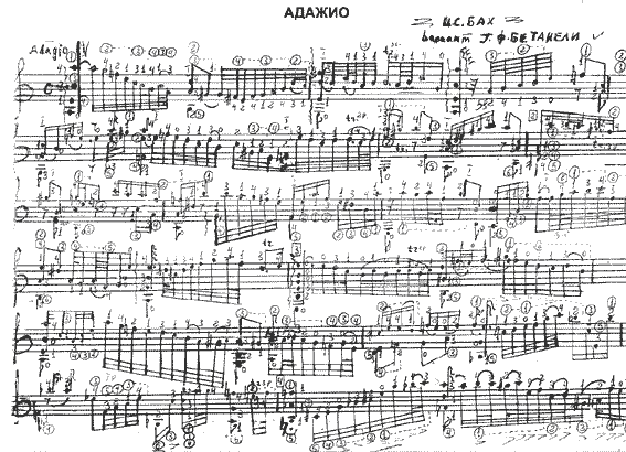 Наконец решилась и «Адажио» переложила на Б. 2 вверх. После, досконально разобравшись в ритмических улочках и переулочках (широченных ритмопроспектов в «Адажио» не сыскать, сложнейшие текстовые фигуры изобилуют неординарными ритмическими перепадами — авт.), постаралась не утерять особый настрой звучания баховского психологизма, проставить наиболее удобную для гитары аппликатуру. [31]