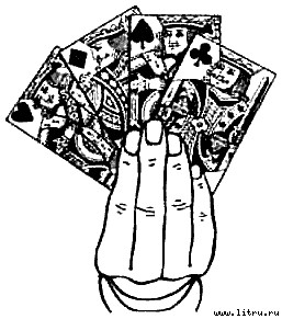 Держим восьмерки в руке так, чтобы нижнее очко было закрыто указательным и безымянным пальцами. Благодаря этому зрители примут их за семерки. Обратите внимание всех, что вы держите в одной руке четыре короля, а в другой — четыре семерки (на самом деле восьмерки).
