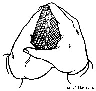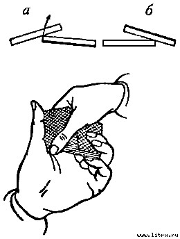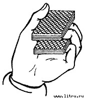 Он похож на первый способ, но не так изящен. Карты берем в левую руку рубашкой вверх. Но сейчас на те карты, которые должны быть переложены на верх колоды, кладем средний и безымянный пальцы, а указательный и мизинец кладем под колоду. Теперь нижняя половина колоды как бы стиснута выпуклыми щипцами, между средним и безымянным пальцами сверху и указательным и мизинцем снизу. Затем прикрываем колоду правой рукой, как и в первом способе. Но сейчас берем ее между указательным и безымянным пальцами сверху и большим пальцем снизу верхнюю половину колоды. Немного приподнимаем верхнюю половину, чтобы освободить место для нижней половины, одновременно немного ослабляя пальцы левой руки. При этом нижняя половина описывает четверть окружности. Когда верхняя половина уже не закрывает нижнюю, обратным движением (т. е. немного сгибая пальцы левой руки и убирая правую руку) обе половины колоды опять складываются вместе, но в другом порядке.