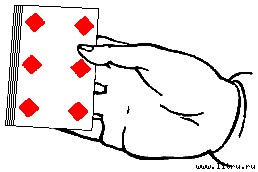 Колоду держим в левой руке рубашкой вверх. Запоминаем нижнюю карту. Незаметно немного выдвигаем ее вперед и держим эту выступающую часть карты большим пальцем и мизинцем правой руки. При этом правая рука накрывает карты сверху.