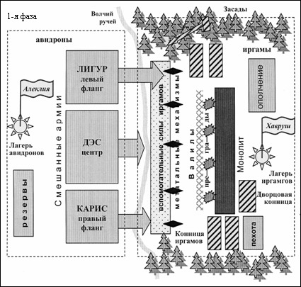 Дворцовая конница останавливает Лигура. В это время Дэс в центре атакует своими валилами валилы противника. Большая часть его сил, прежде всего авидронский монолит, бездействуют. Карис, возглавляющий правый фланг, атакует конницу иргамов, но некоторое время спустя сам с большим трудом сдерживает ее натиск. Несколько конных отрядов иргамов прорываются в тыл авидронам, но воинам Инфекта при помощи резервных партикул удается обратить всадников в бегство.