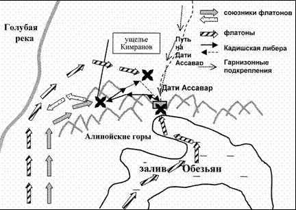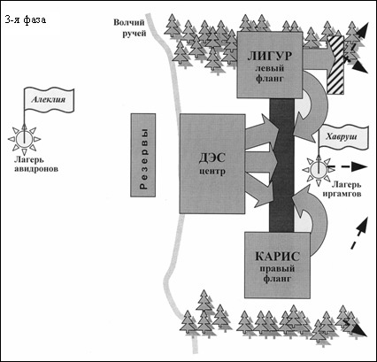 Лигур разбивает Дворцовую конницу. Ополчение и другие иргамовские отряды спасаются бегством. Правого фланга Хавруша более не существует. Авангарды Лигура оказываются в тылу монолита и атакуют его. Дэс уничтожает валилы иргамов. Карису на правом фланге также удается опрокинуть противостоящие ему силы. Часть партикул он посылает преследовать отступающих. Хавруш приказывает отходить и во избежание пленения сам спешно покидает лагерь.