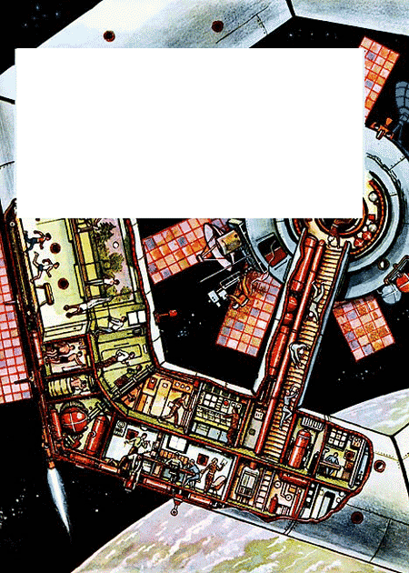 Транспортный корабль, на котором мы вышли на орбиту, медленно подходит к станции. Мы смотрим на неё в иллюминатор и не можем налюбоваться. Огромное сооружение, напоминающее колесо на оси, медленно поворачивается, залитое лучами Солнца. У него удивительно умный вид! Ни одного пустого места. Всюду какие-то люки, окошечки, выступающие смотровые кабины, вделанные в стены приборы, антенны, чаши локаторов, поручни, прожектора, панели солнечных батарей, стыковочные узлы, сопла двигателей ориентации, трубки с проводами и ещё сотни и тысячи всяких мудрёных и очень красивых деталей.