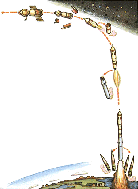 Посмотрите на рисунок. Ракета составная, или, как говорят, многоступенчатая. Она состоит из нескольких отдельных секций, или самостоятельных ракет, соединённых между собой.