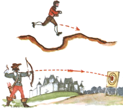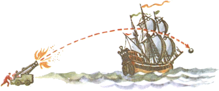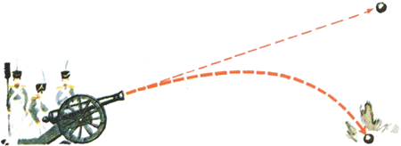 Стреляем! Чертим траекторию — путь, по которому летит снаряд. Вначале он летит прямо вперёд. Туда, куда его вытолкнули пороховые газы. Земля с первой же секунды начинает его притягивать. Она как бы «гнёт» траекторию к себе. Подобно ветке дерева. Траектория получается изогнутой. Своим концом она склоняется до самой Земли. В этом месте снаряд падает на поверхность земного шара.