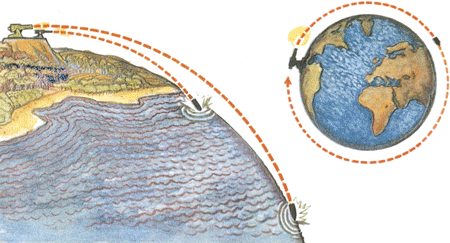 Ещё немного увеличиваем пушку. «Ветка» теперь сгибается ещё меньше. Лишь настолько, насколько круглится под ней поверхность земного шара. Снаряд облетает Землю, проносится мимо пушки и уходит на второй круг. Потом на третий. Начинает летать вокруг Земли. Его траектория замкнулась в кольцо.