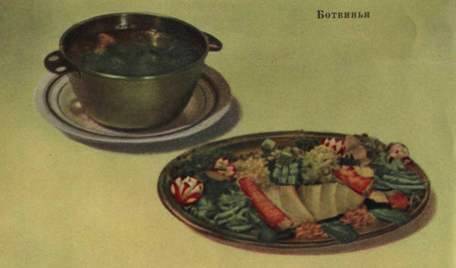Ботвинью готовить с белугой, осетриной, судаком (свежим) или балыком белорыбьим и осетровым, треской, а также с консервированными крабами.