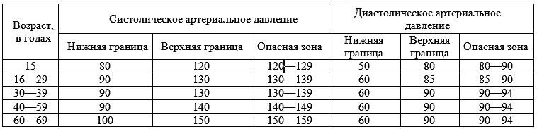 Замечено, что с возрастом артериальное давление повышается, но каких-то определенных показателей для того или иного возраста не существует. Для каждой возрастной группы установлены нижние и верхние границы колебаний верхнего и нижнего артериального давления, определен диапазон нормы и выделена так называемая опасная зона (табл. 1).