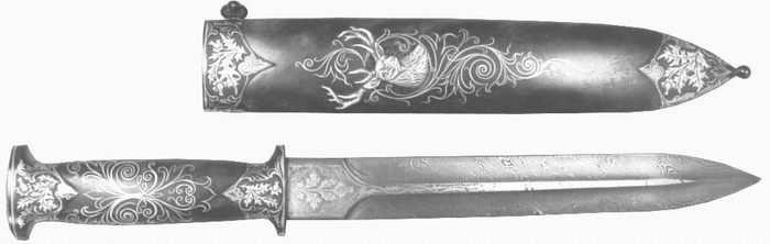 В Германии олений кинжал – непременный атрибут парадной охотничьей одежды, они красивы и тщательно изготовлены, их клинки гравированы сценами из охотничьей жизни. Рукоять и ножны кинжала отделаны изящными деталями под золото. На рукояти из рога, как звезды на генеральских погонах, сияют золотые желуди (фото 5). Остроконечный кинжал являлся непременным атрибутом на старинной русской псовой охоте. Когда борзые достали и уже взяли волка, то охотник соскакивает с лошади и принимает зверя. Другими словами охотник откалывает его: схватив зверя за заднюю ногу, ударом кинжала под лопатку, нужно прикончить его. Если, конечно, не стоит задача сострунить волка, то есть взять его живьем, связав лапы и, вставив в пасть поперек палку. Добивать зверя арапником или кистенем, не слезая с лошади, всегда считалось у русских охотников неэтичным. У русских псовых охотников в особой чести были кинжалы златоустовских оружейников. Златоустовский завод на Урале был создан в 1815 году по указу императора Александра Первого, и первыми мастерами на этом заводе были немцы из знаменитого Золингена, приглашенные работать в России. Потом Златоустовский завод стал всемирно известным центром по производству высококачественного русского холодного оружия. Славились в России нижегородские кузнецы, особенно из небольшого городка Ворсмы и из поселка Павлово-на-Оке. Отличное холодное оружие изготавливали умельцы-туляки.