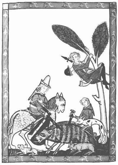 То, что на Руси называлось «рогатиной», в Европе считалось «кабаньим копьем». С таким копьем европейские охотники добывали дикого вепря в густых лесных зарослях. На кабанье копье подвешивали плюмаж из конского волоса или медвежьего меха. Это делалось не столько для украшения копья, сколько препятствовало литься на древко потоку крови из нанесенной раны, иначе руки охотника будут соскальзывать. Однако кабанье копье считалось оружием слуг-егерей, сам охотник-господин такое копье в руки никогда не брал. На вельможной охоте, когда егеря с собаками уже затравили зверя, то самый последний удар должен был нанести сам хозяин охоты или приглашенный им почетный гость. По охотничьему этикету считалось правильным, если затравленного зверя приканчивали не ударом длинного копья, а охотничьим кинжалом. В Западной Европе всеобщим уважением пользовались охотники, которые добывали грозного дикого вепря с помощью охотничьего кортика, его также называют «кабаньим мечом» или «хиршфингером». Клинок охотничьего кортика узкий и довольно длинный, почти в полметра. Пока злобные собаки держат зверя на месте, герой-охотник смело лезет в эту рычаще-визжащую свару, опрокидывает дикого вепря на спину и закалывает его точным ударом в сердце (фото 4).